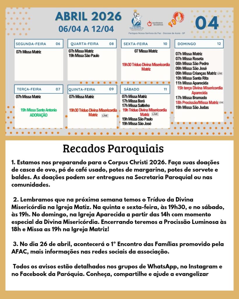 - CALENDARIO SEMANAL E RECADOS PAROQUIAS06 a 12 ABRIL 2026
