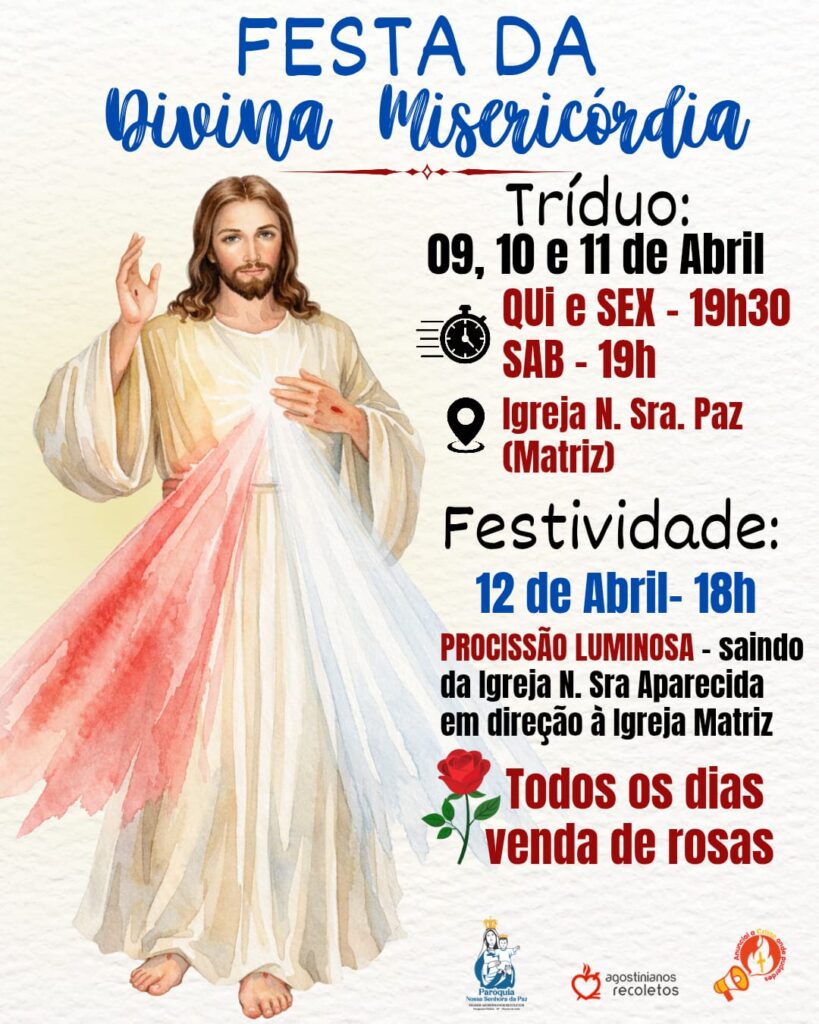 - FESTA DA DIVINA MISERICÓRDIACom grande alegria, convidamos você e sua família para vivenciar dias de profunda graça, fé e confiança no amor infinito de Deus, participando do Tríduo da Divina Misericórdia.Serão momentos de… Leia mais: FESTA DA DIVINA MISERICÓRDIA