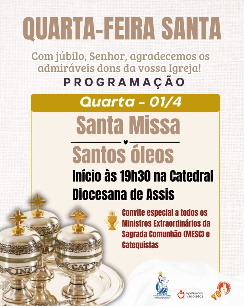 - SANTA MISSA – SANTOS ÓLEOS01/04/2026 Quarta-feira Santa ✝️Um dia de graça com a bênção dos Santos Óleos.Participe conosco!
